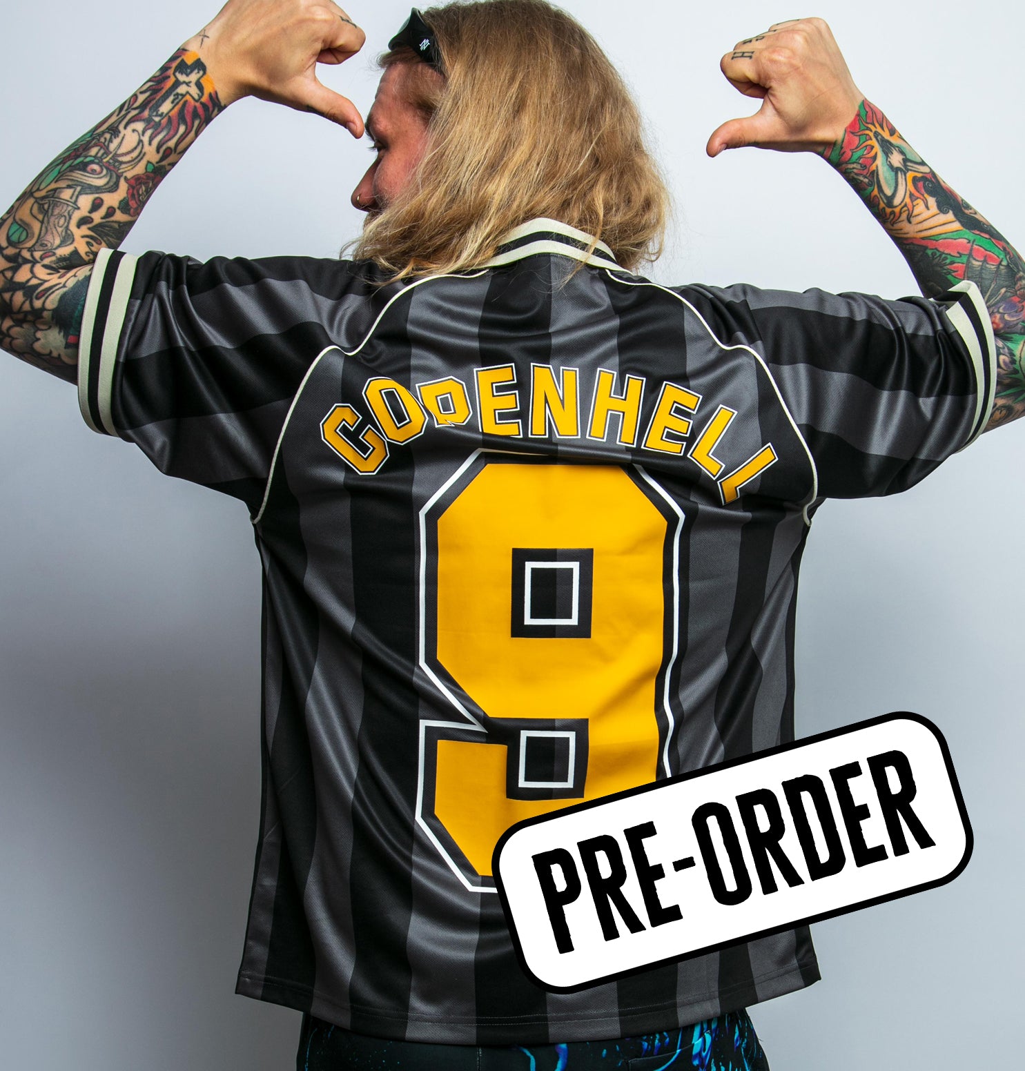 The highly popular football jersey is back in stock! Retro football jersey in polyester with woven patches, embrodiered stars and printed back. Straight out of the darkest soccer league in hell. Act fast, as it sold out very quickly at this year's festival! Please check the size chart to ensure it fits you!.